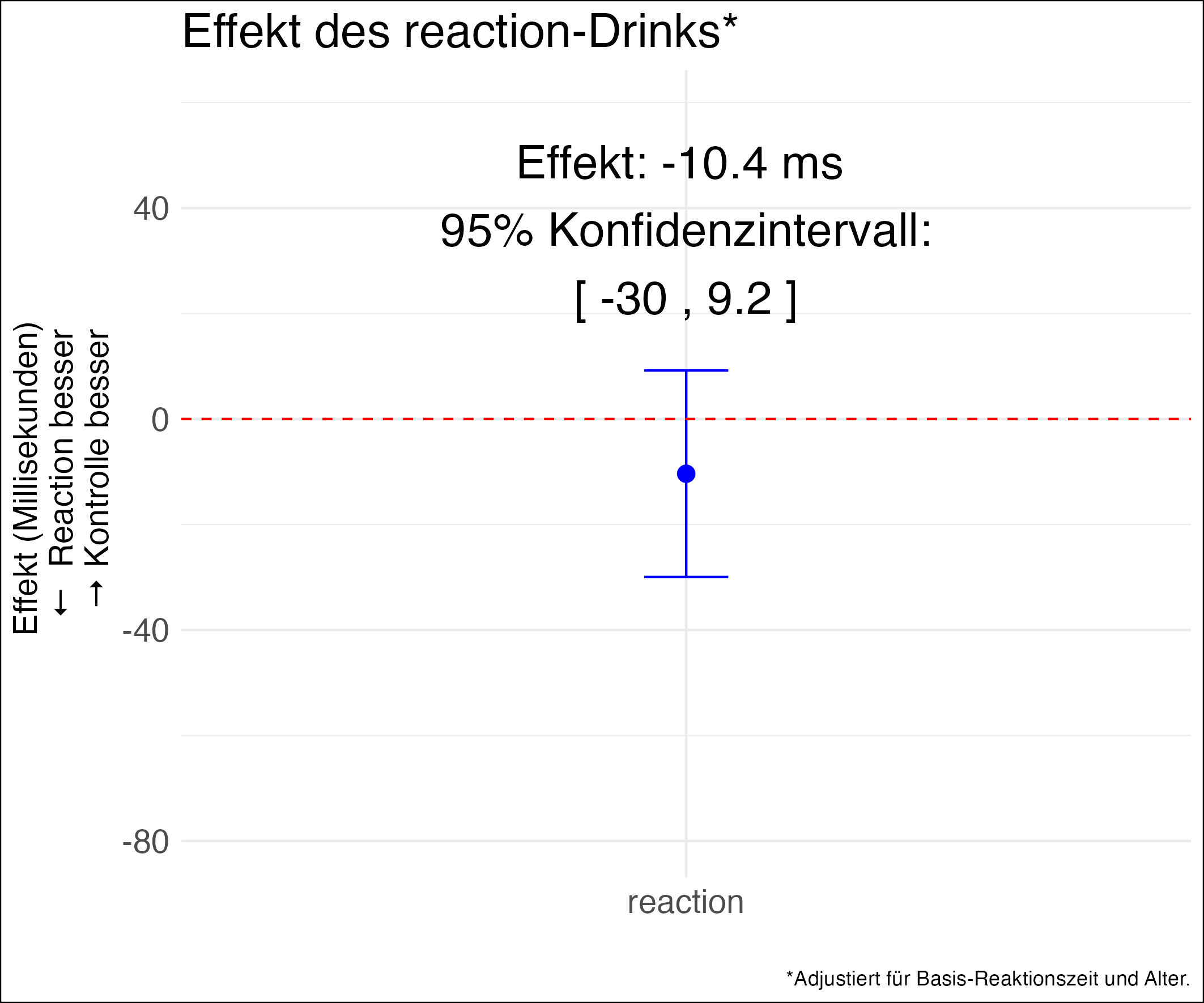 Die statistische Modellierung ergibt, dass die mittlere Differenz der Reaktionszeit zwischen der reaction Gruppe und der Kontrollgruppe -10.4 ms beträgt. Da das 95%-Konfidenzintervall den Nulleffekt (d.h. kein Effekt des reaction Drinks) beinhaltet, schliessen wir daraus, dass kein statistisch relevanter Effekt des reaction-Drinks in der Gesamtpopulation vorliegt. Diese Schätzwerte wurden für die Basis-Reaktionszeit und Altersgruppen adjustiert.